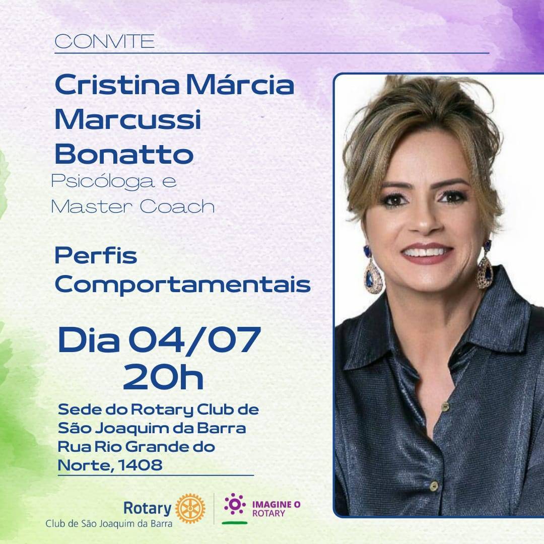 O Rotary Club de São Joaquim da Barra convida para a palestra "Perfis Comportamentais", com a Psicóloga e Master Coach Cristina Bonatto.